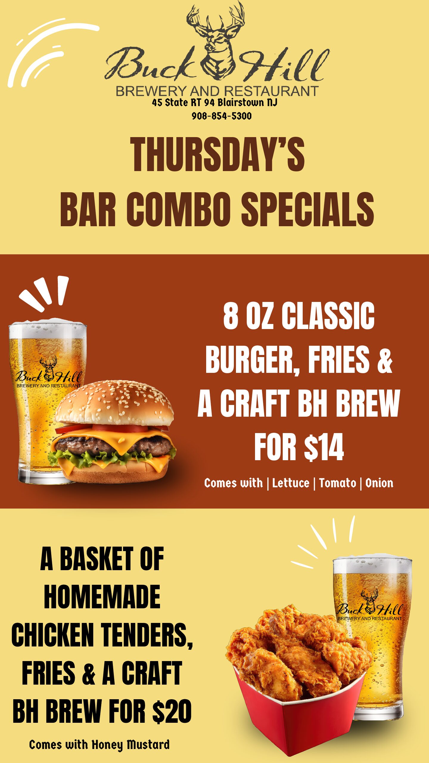 Your Choice of Burger/Fries/Brew for $14 or Chicken Fingers/Fries/Brew for $20 All Day Long